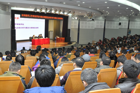我校本科教学工作审核评估经过学校自评和专家进校考察,现已进入评估整改阶段。经过认真审读专家反馈意见及全面自查总结,12月14日我校本科教学工作审核评估专家反馈意见总结分析与整改工作方案布置会在图书馆一楼报告厅召开。学校领导、全体处级干部、教务处、教学质量评估中心全体工作人员、各学院(部)正副系主任、教务科长(教务秘书)及辅导员参加了本次会议。会议由校党委书记冯晓主持。