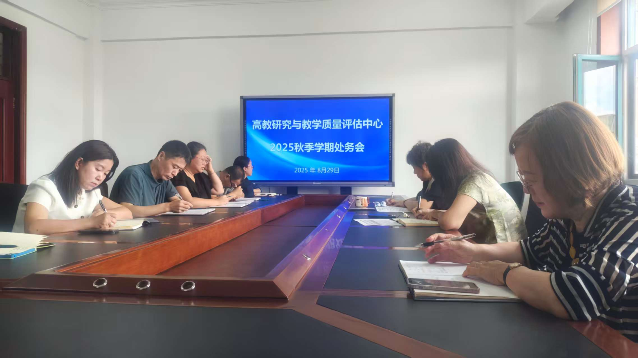 8月29日上午,评估中心在主楼406会议室召开2025秋季学期第一次处务会,安排部署本学期重点任务,会议由评估中心主任黄嘉鑫主持,评估中心全体人员参加会议。